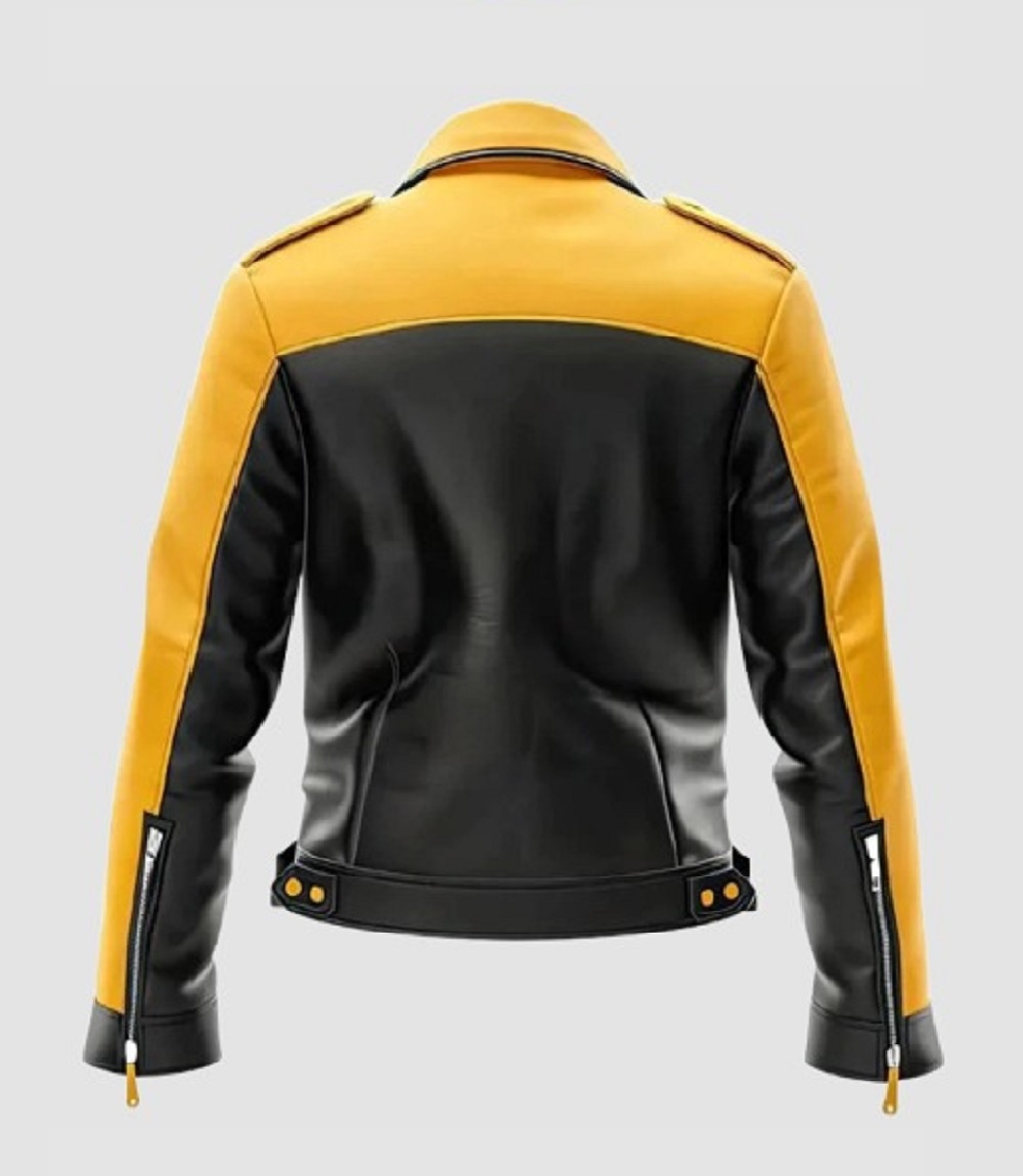 Men’s Yellow and Black Notch Lapel Biker Leather Jacket